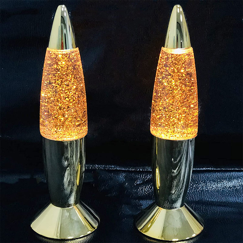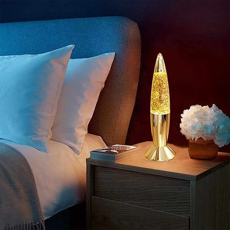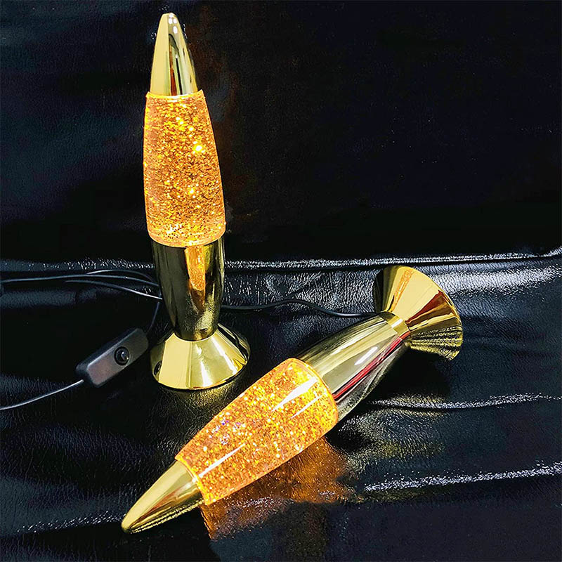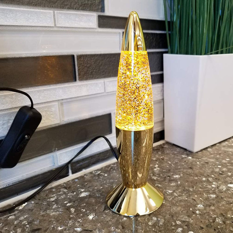 Den 7 tommer glitterlampe har væske inde i flasken. Væsken bevæger sig uregelmæssigt efter opvarmning. der er flasker med forskellige tommer og forskellige farver.
