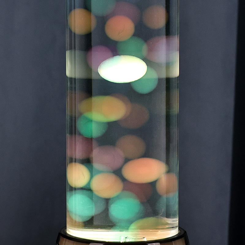 Lampens høje, elegante cylinderform giver den et moderne, minimalistisk look, der komplementerer forskellige interiørstilarter. Dens gennemsigtige krop tillader fuld synlighed af de indre elementer, inklusive de flydende vandmænd og de flimrende lysrefleksioner. Væsken indeni er specielt formuleret til at simulere vandstrømmen, hvilket øger realismen i den flydende bevægelse. Efterhånden som LED'erne skifter farver, ser vandmændene ud til at pulse af liv, hvilket tilføjer dybde og bevægelse til scenen.