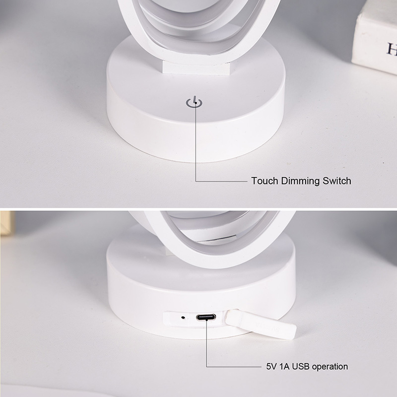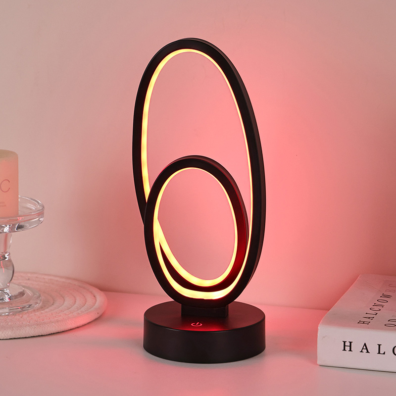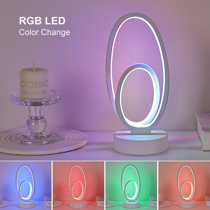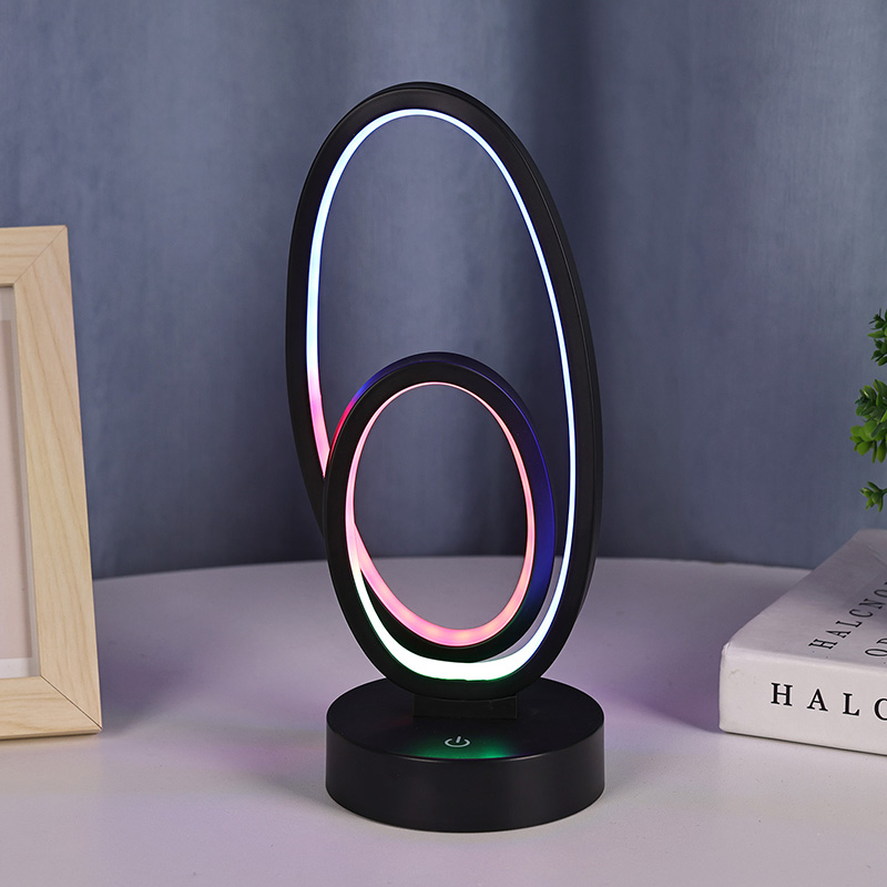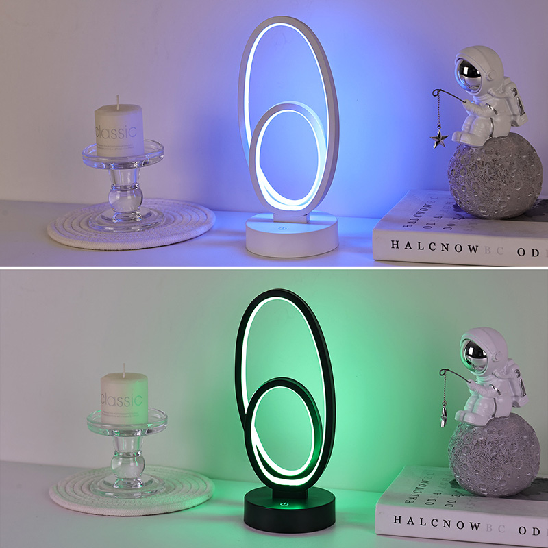 Dobbelt cirkulær ringskærm RGB-skrivebordslampe er en kunstnerisk accent til hjemmet, med DC sikker lavspændingsstrømforsyning for stabil og energieffektiv ydeevne, hvilket sikrer sikker brug. Velegnet til forskellige scenarier såsom stuer, børneværelser, studieområder og soveværelser
