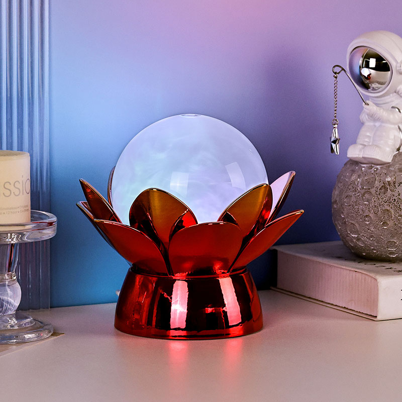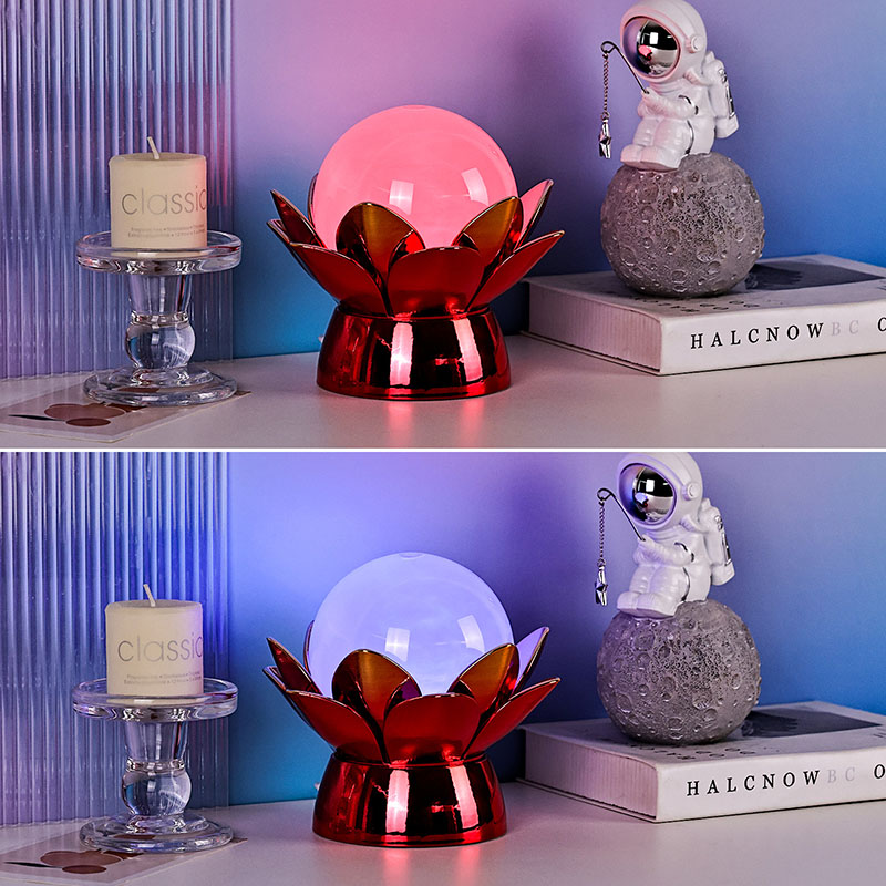 Inde i kloden tilbyder avanceret LED-belysning flerfarvet belysning, så brugerne kan tilpasse stemningen med bløde nuancer såsom varm hvid, blid pink, beroligende blå og gylden gul. Den farveskiftende funktion kan styres manuelt eller indstilles til at cykle automatisk, hvilket giver et dynamisk og fængslende display, der udvikler sig over tid. Denne omgivende belysning er ideel til soveværelser, stuer, yogarum eller som en tankevækkende gave til dem du holder af, der sætter pris på skønhed og ro.