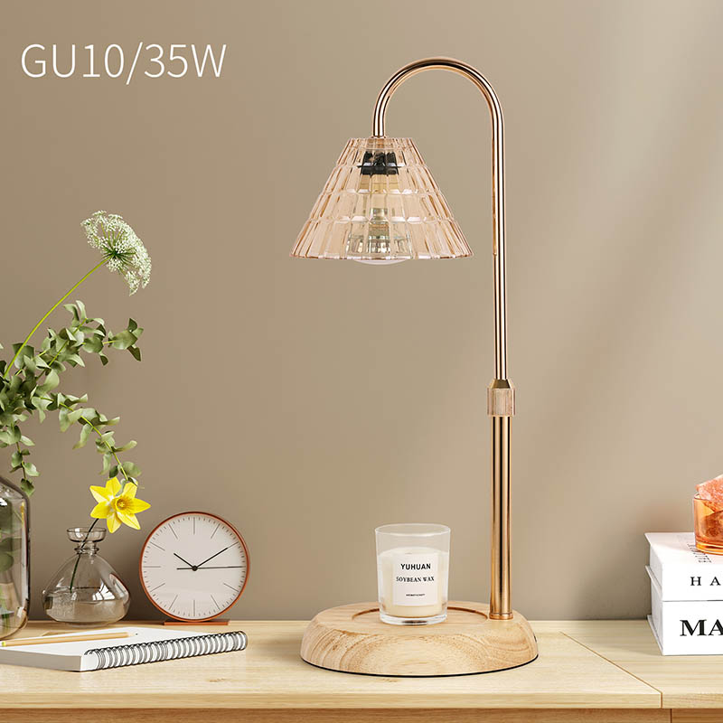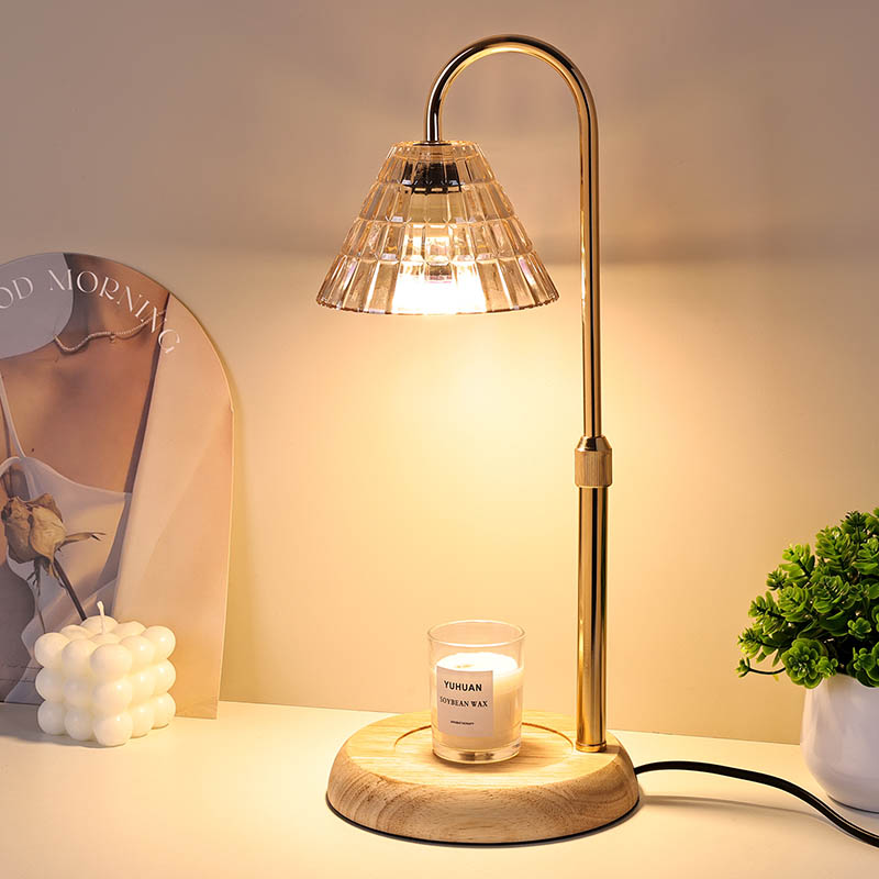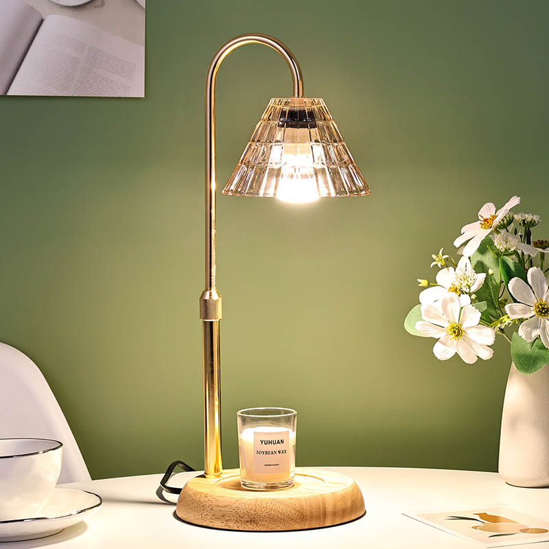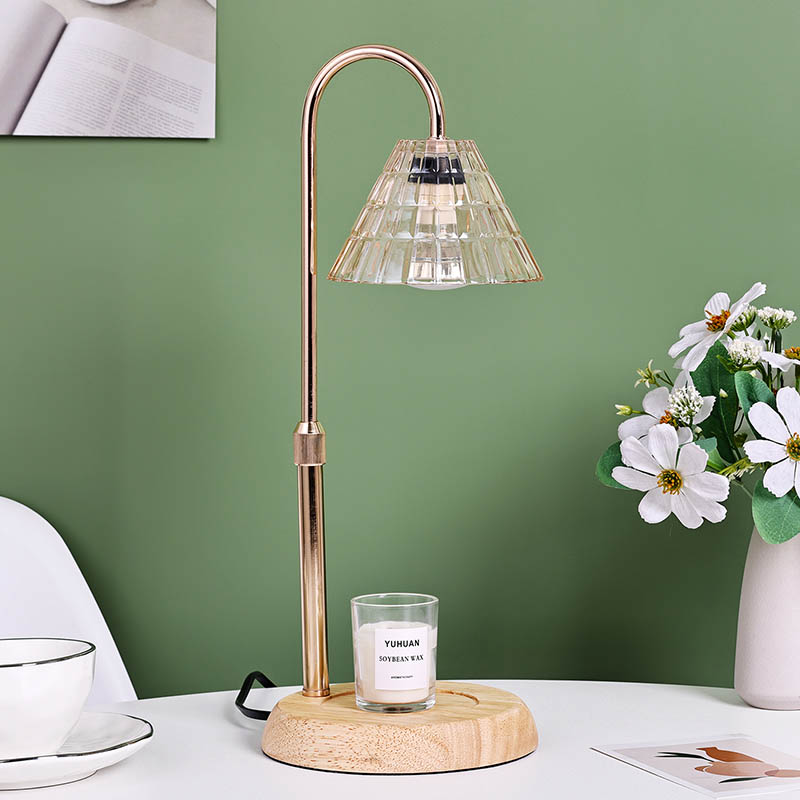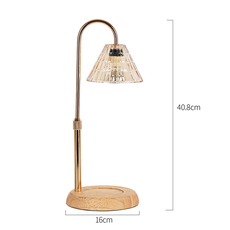 Glasskærmbordlampe med juster højde er en traditionel designstil, der består af en traditionel pære med en træfod og en gylden metallygtepæl.