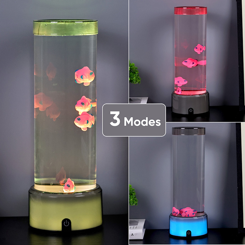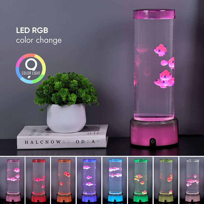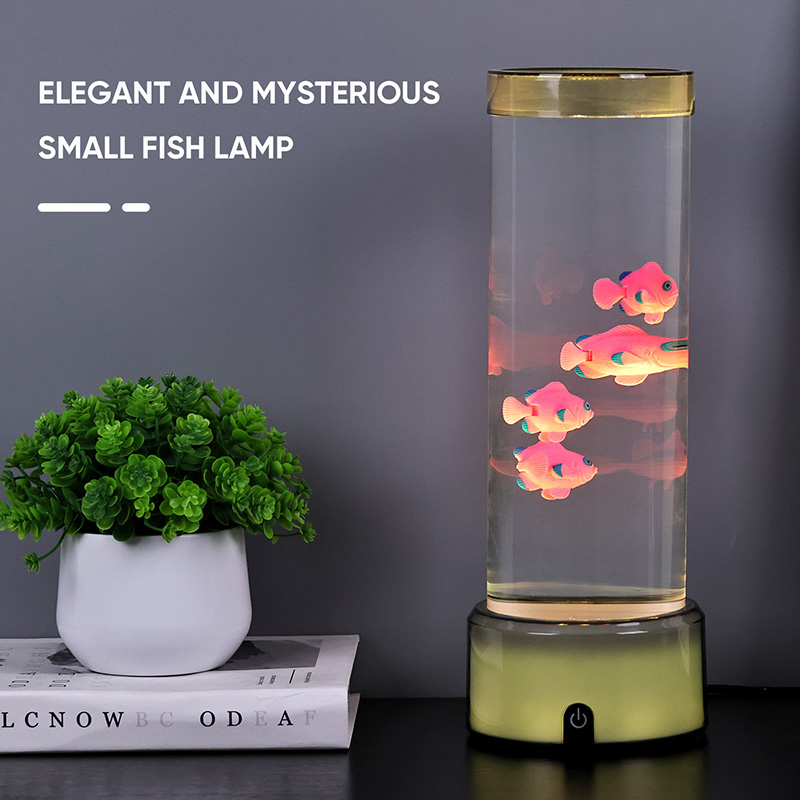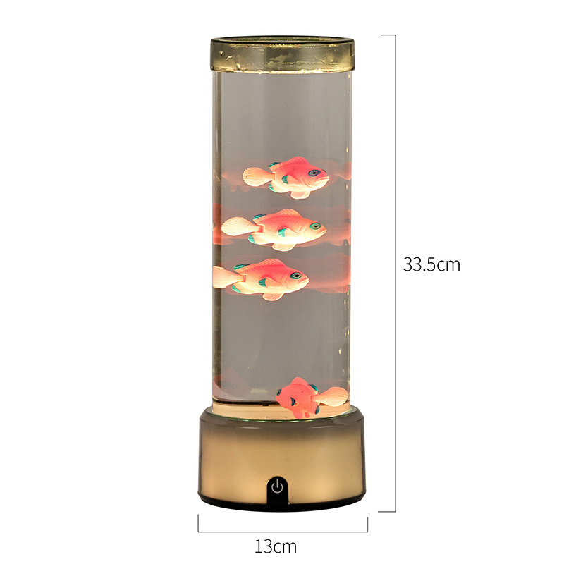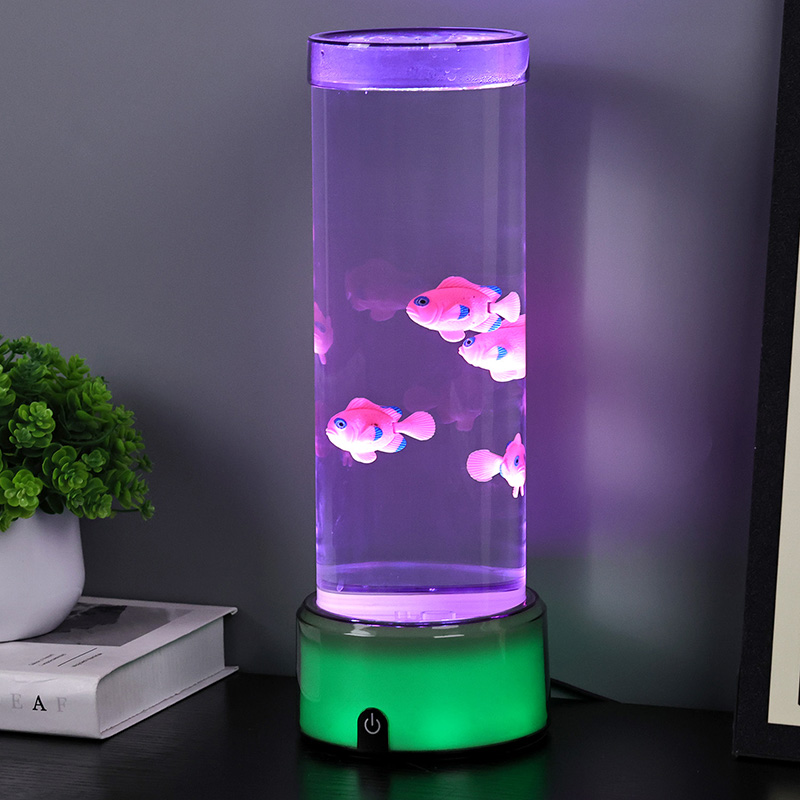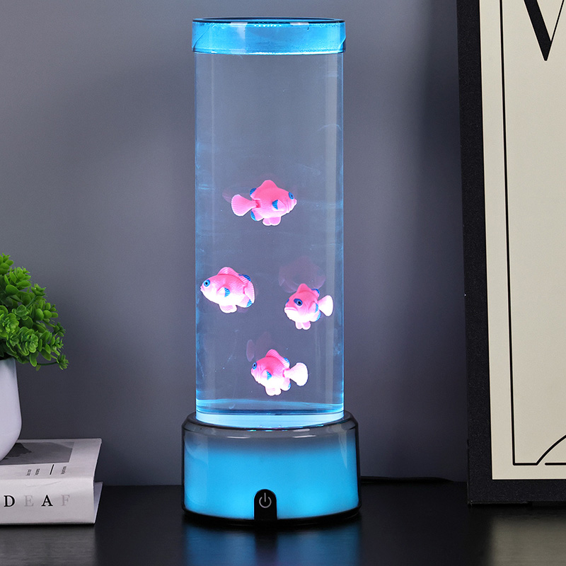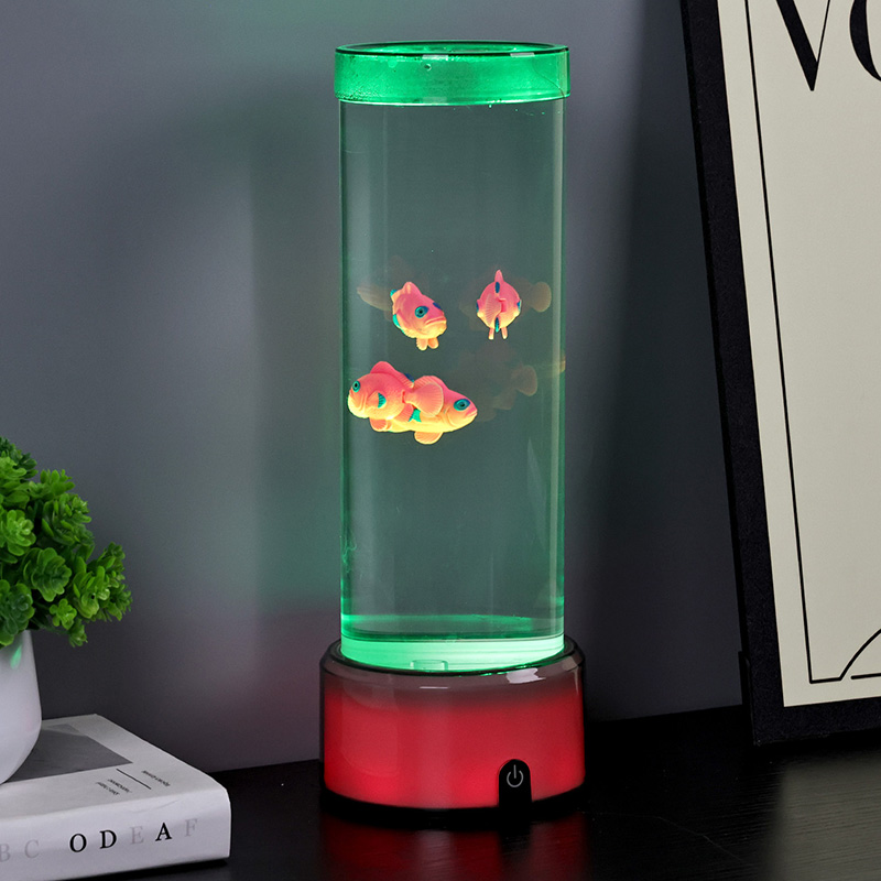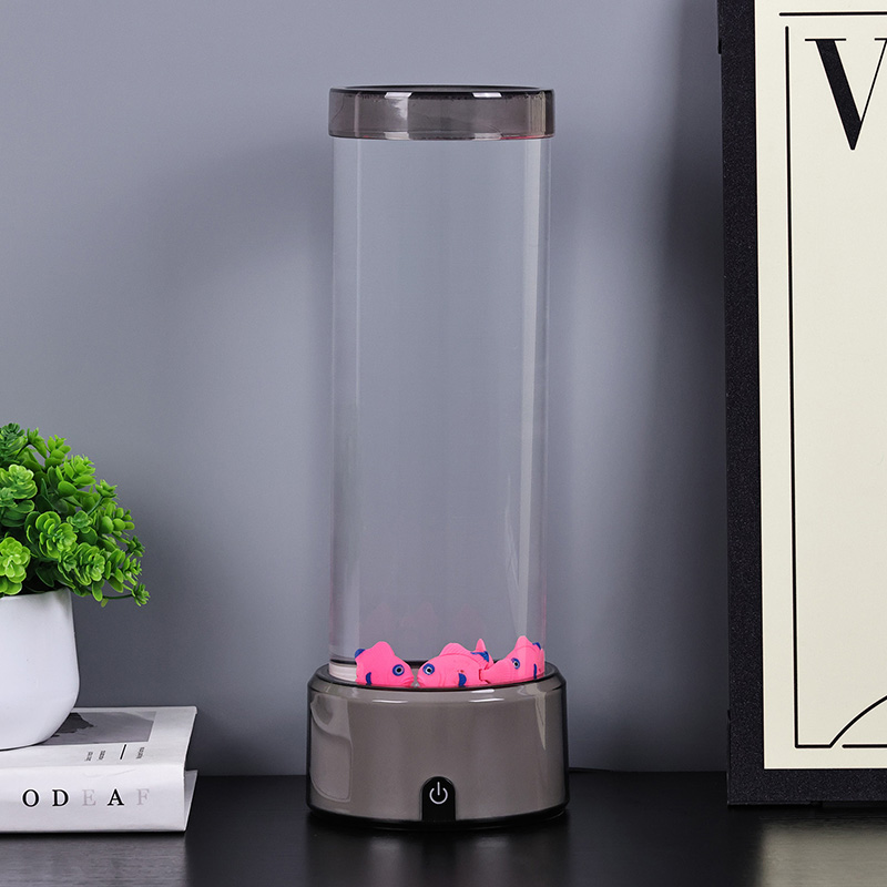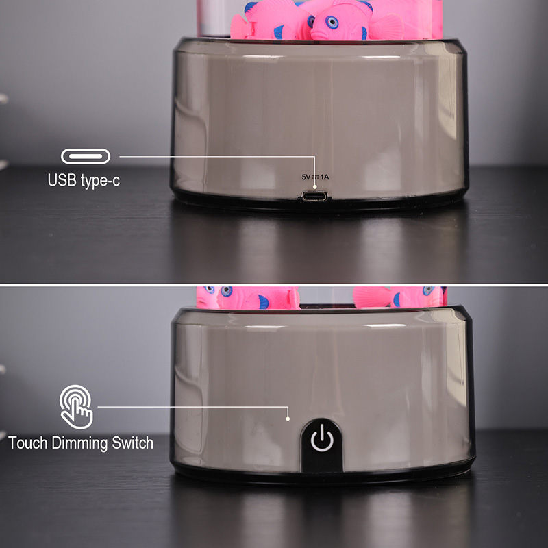 Berøringsvalgsknap & vandmænd svømmerJellyfish Fish Lamp med RGB-base dekorativ lampe, et nydesignet børnelegetøj med et cylindrisk vandholdende design. Efter påfyldning med vand placeres tre små fisk indeni. Vandmændsfiskelampen med RGB-base kan svømme op og ned, når den lille motor i bunden roterer. Samtidig har basen RGB-farvetransformation. Det største højdepunkt ved dette produkt er, at bunden også ændrer sig med farvetransformation. Hele plastikdesignet er meget let uden vandtilbageholdelse, hvilket er meget praktisk til transport. Strømkilden til fiskelampen leveres af USB type C lavspænding, hvilket er meget praktisk