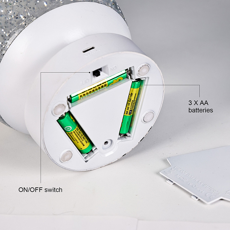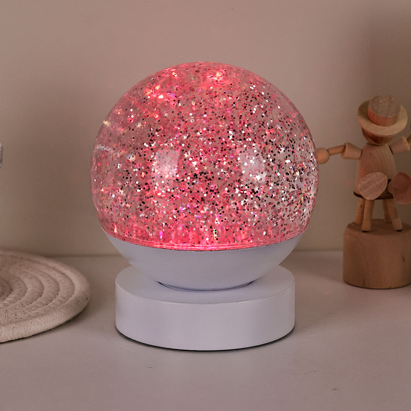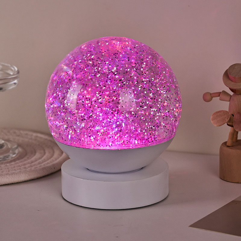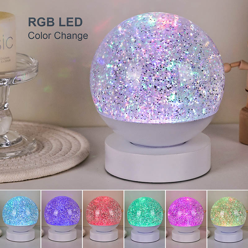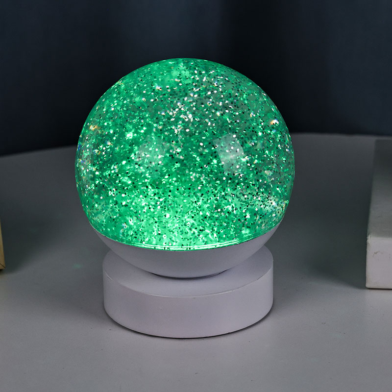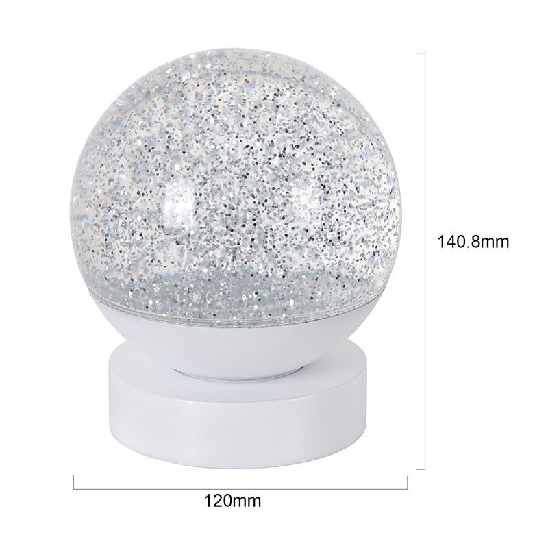 Led RGB Glitter Decor Lamp er lavet af akrylmateriale af høj kvalitet, med en gennemskinnelig kugle med fremragende lystransmission. Basen er lavet af miljøvenlig ABS-plast, hvilket sikrer stabilitet, holdbarhed og sikkerhed uden giftige stoffer. Den fungerer på tre indbyggede AAA-batterier (batterier sælges separat), hvilket eliminerer behovet for en stikkontakt og tilbyder praktisk brug. Perfekt til placering ved sengen, skrivebordet eller i et barns legetøjshjørne. Med en simpel berøringskontakt kan lyset nemt tændes eller slukkes, hvilket gør det brugervenligt selv for børn at betjene selvstændigt.