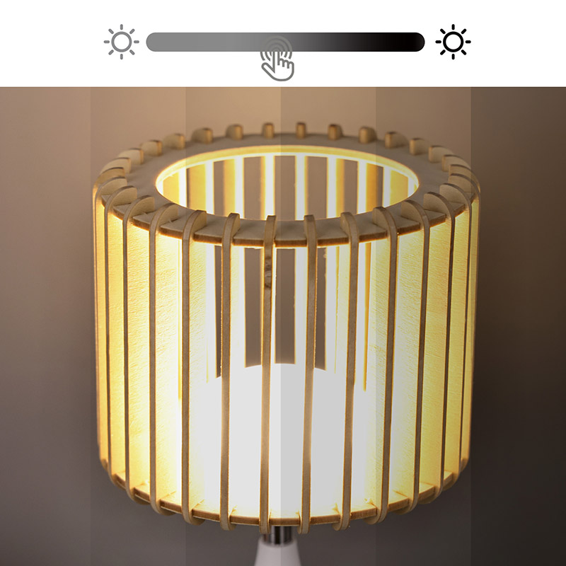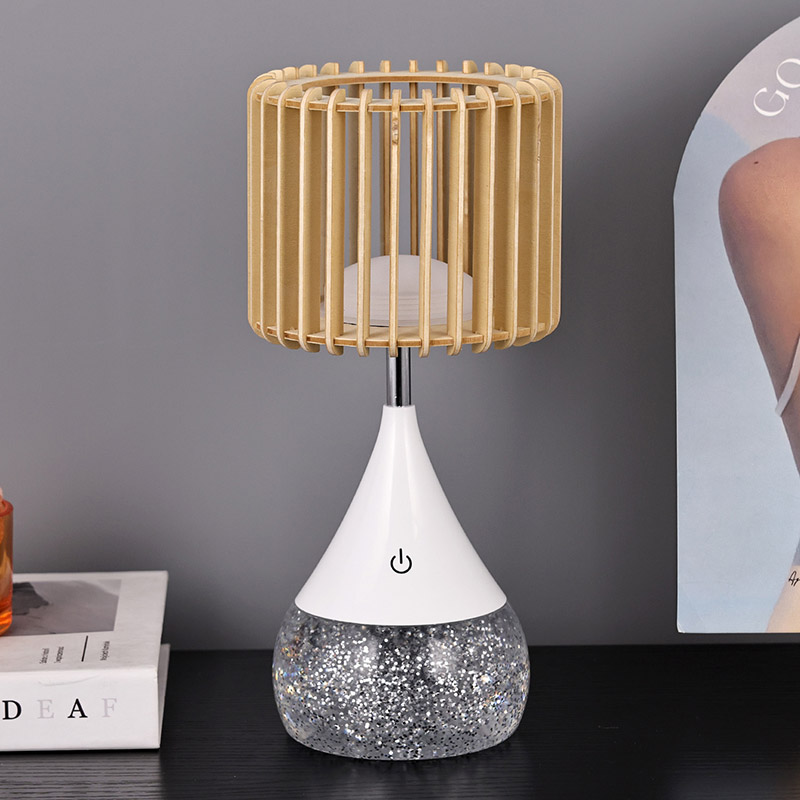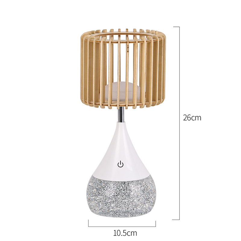 Den nye design LED-bordlampe er lavet med præcision og har et slankt og elegant design lavet af holdbare plastmaterialer. Lampeskærmen er lavet af naturlige trælameller, hvilket skaber et visuelt slående og moderne udseende. Uanset om du placerer den på dit skrivebord, natbord eller en hvilken som helst anden overflade, vil denne lampe helt sikkert fængsle og glæde.