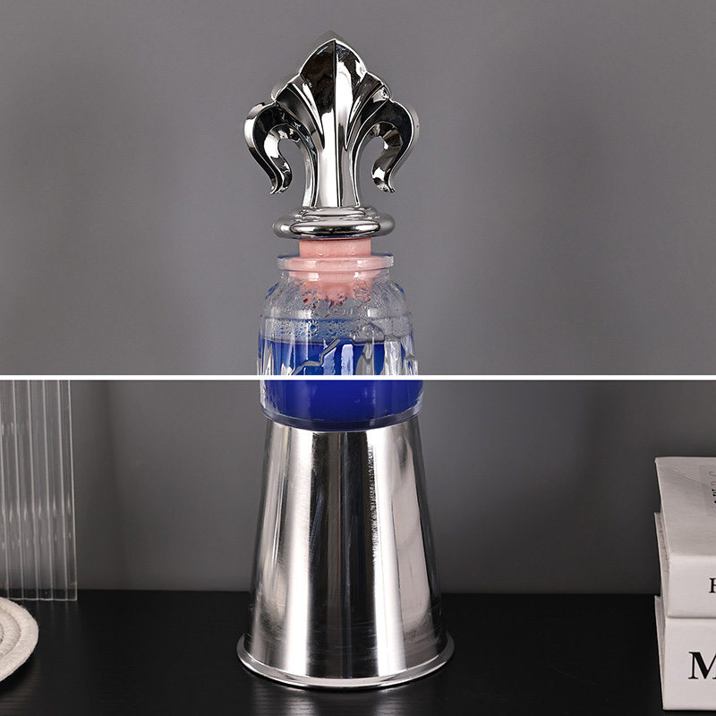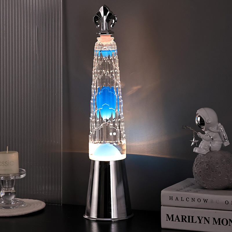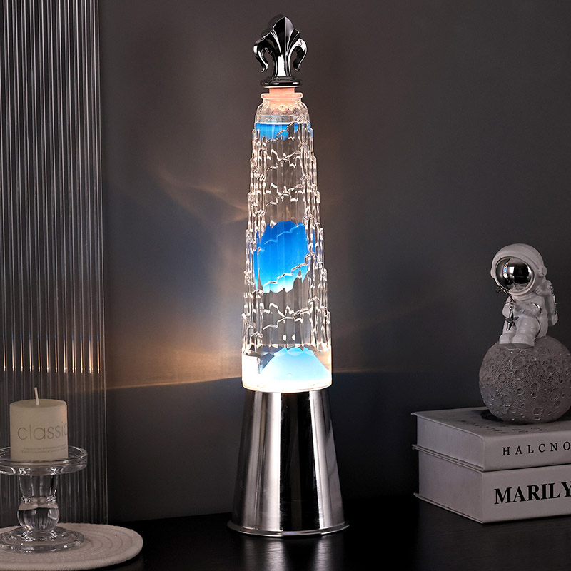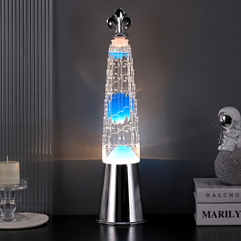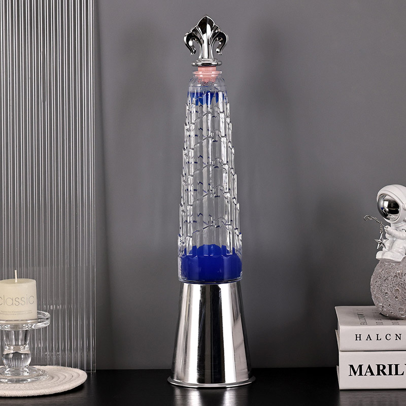 Tårnskærm lavalampe bordlampe har et klassisk tårnformet design med udsøgte sorte metaldekorationer indlejret i toppen, enkel, men ædel. Inde i den gennemsigtige glasflaske er der blå voks